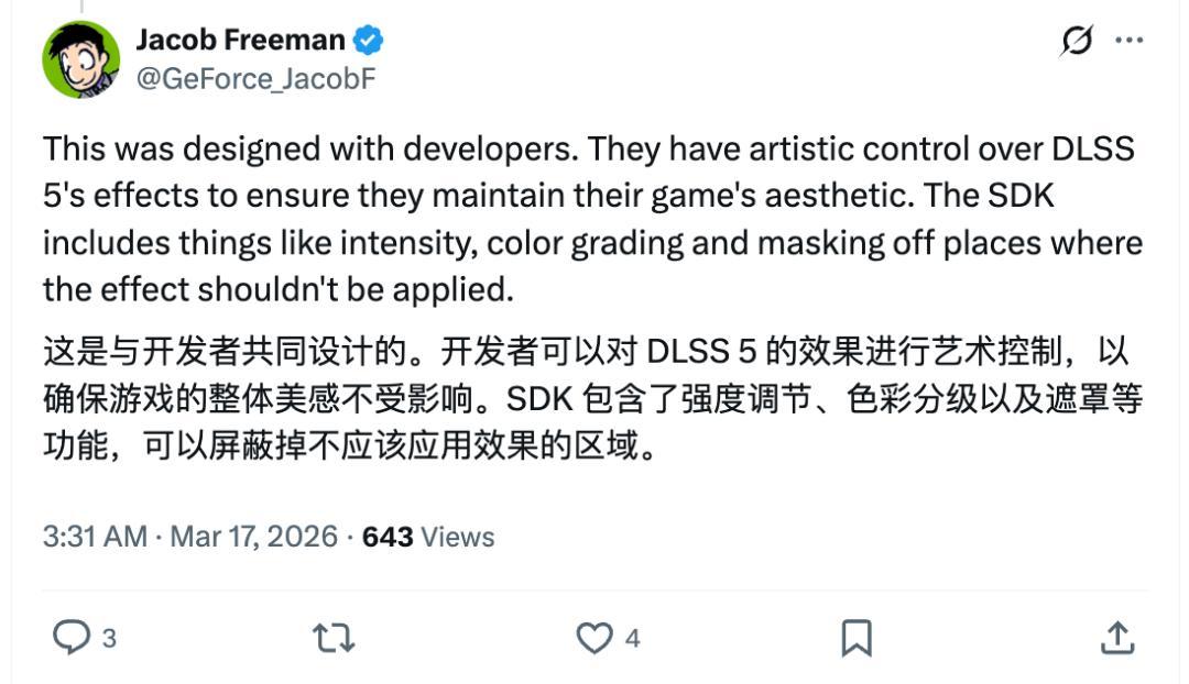 英伟达的布道师雅各布·弗里曼也出来强调,开发者“可以对 DLSS 5 的效果进行艺术控制,以确保游戏的视觉美感不受影响”。